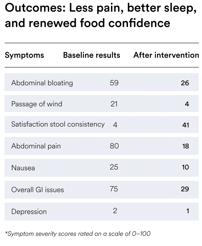 Over several weeks, the patient’s abdominal pain, bloating, and nausea reduced markedly, with a 78% improvement in abdominal pain. This was accompanied by better stool form, improved sleep, and a measurable increase in dietary variety.