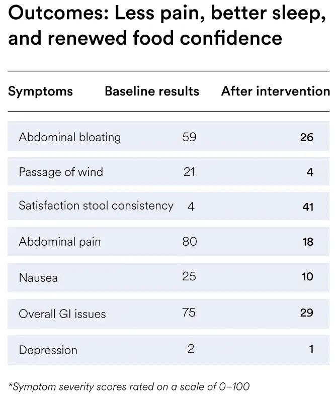 Over several weeks, the patient’s abdominal pain, bloating, and nausea reduced markedly, with a 78% improvement in abdominal pain. This was accompanied by better stool form, improved sleep, and a measurable increase in dietary variety.