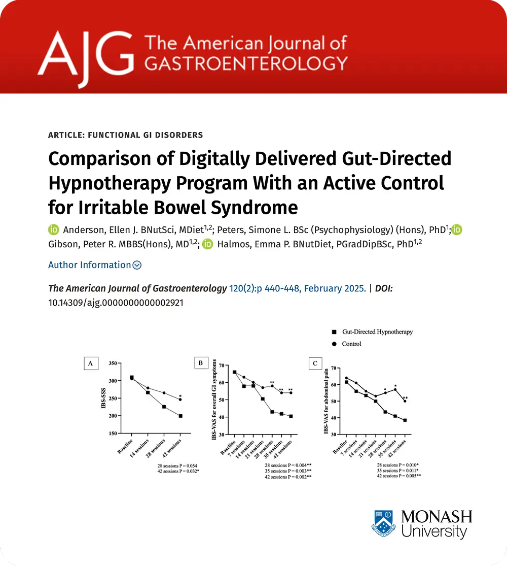 1) Anderson, Ellen J. BNutSci, MDiet1,2; Peters, Simone L. BSc (Psychophysiology) (Hons), PhD1; Gibson, Peter R. MBBS(Hons), MD1,2; Halmos, Emma P. BNutDiet, PGradDipBSc, PhD1,2. Comparison of Digitally Delivered Gut-Directed Hypnotherapy Program With an Active Control for Irritable Bowel Syndrome. The American Journal of Gastroenterology 120(2):p 440-448, February 2025. | DOI: 10.14309/ajg.0000000000002921 2) Peters, S. L., Yao, C. K., Philpott, H., Yelland, G. W., Muir, J. G., & Gibson, P. R. (2016). Randomised clinical trial: the efficacy of gut-directed hypnotherapy is similar to that of the low FODMAP diet for the treatment of irritable bowel syndrome. Alimentary pharmacology & therapeutics, 44(5), 447–459. https://doi.org/10.1111/apt.13706