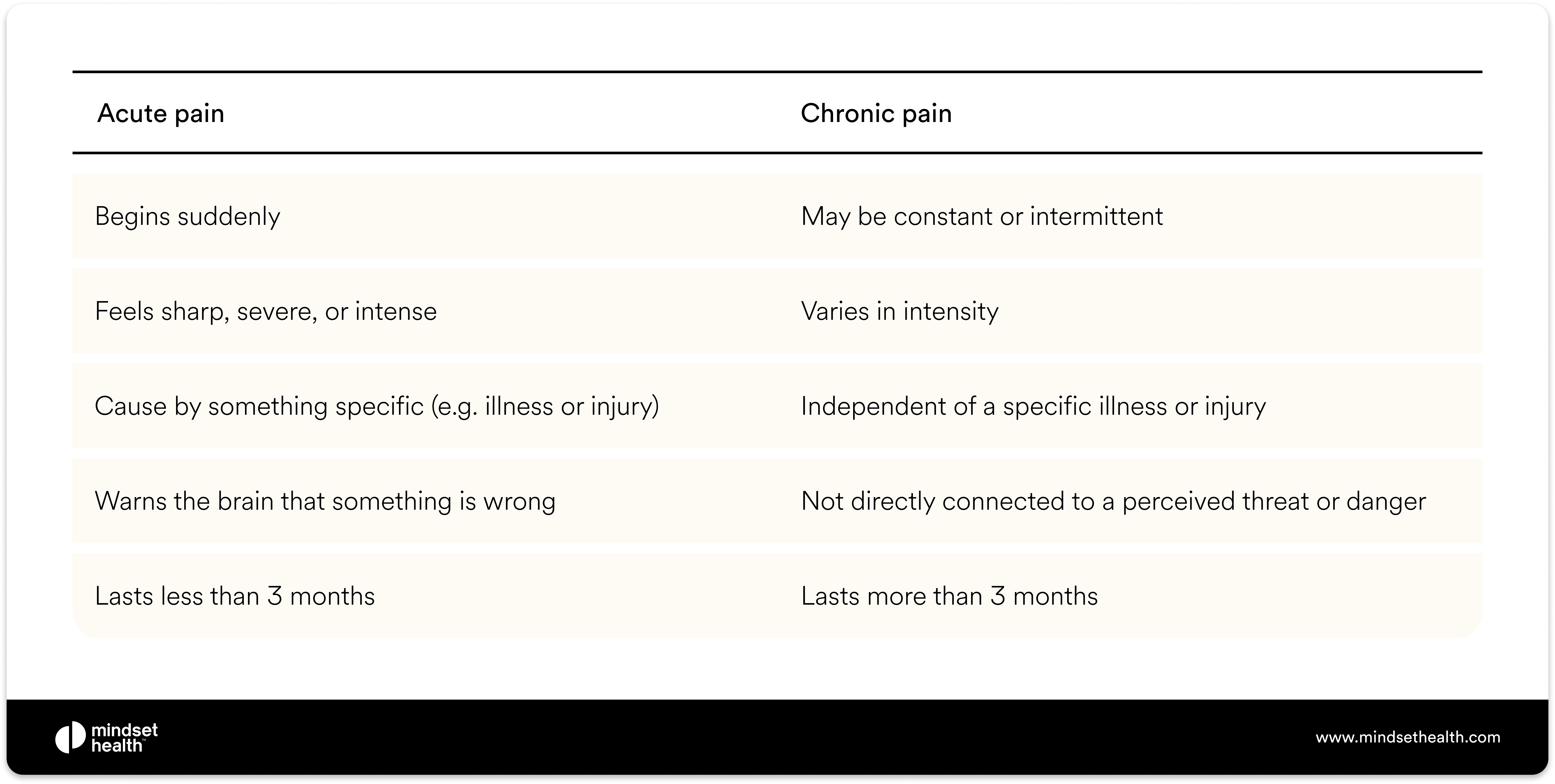 Acute pain is pain that is experienced in response to an injury or illness. It often begins suddenly and can feel sharp, severe, and intense. Acute pain is designed as a protective mechanism to warn the brain that something is wrong. The goal of this is to stop you from doing anything that could further damage the area.