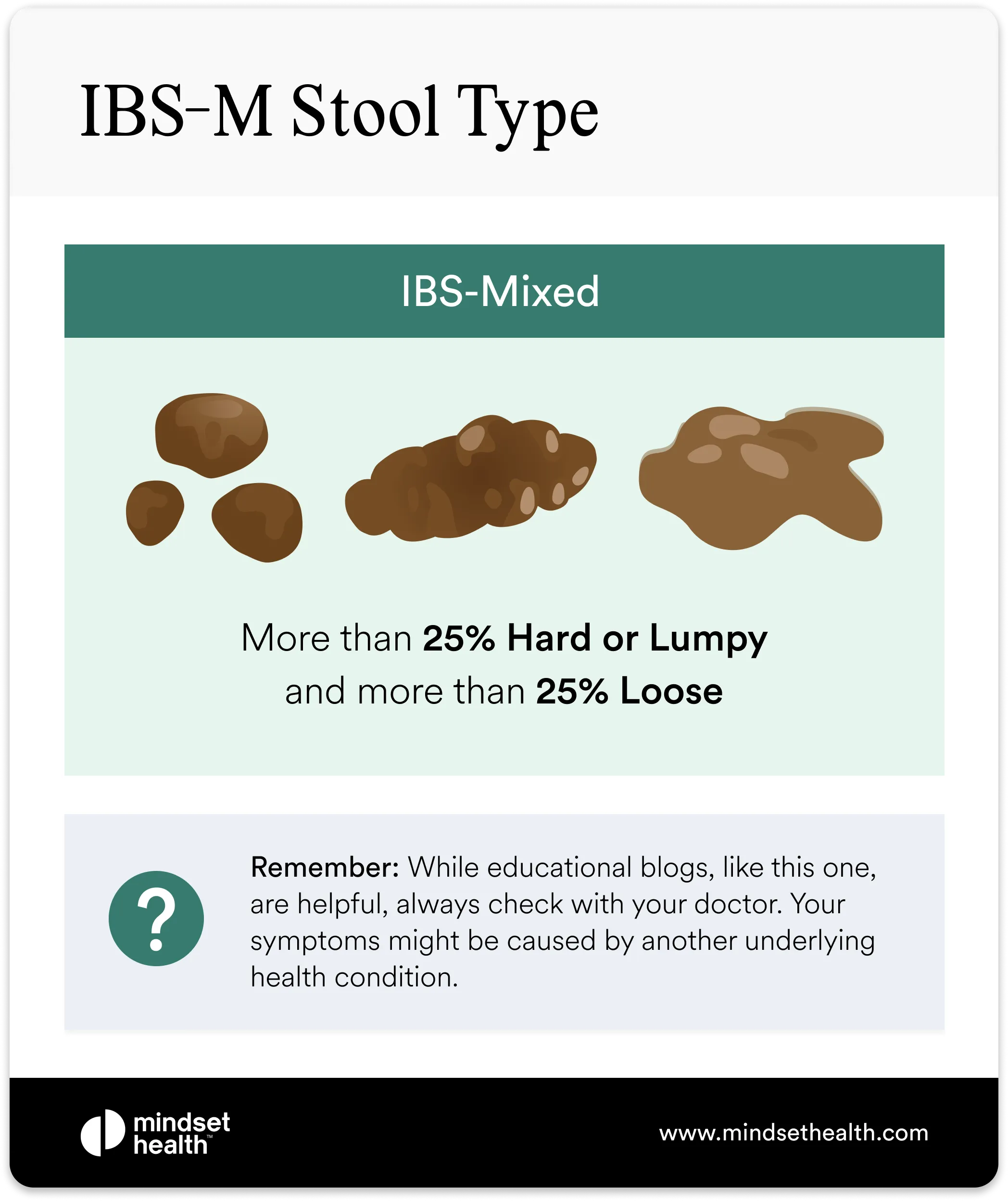 The ‘M’ in IBS-M refers to IBS with ‘mixed’ symptoms. The Rome Criteria for IBS-M state that stools must be hard, lumpy, and loose in consistency at least 25% of the time.