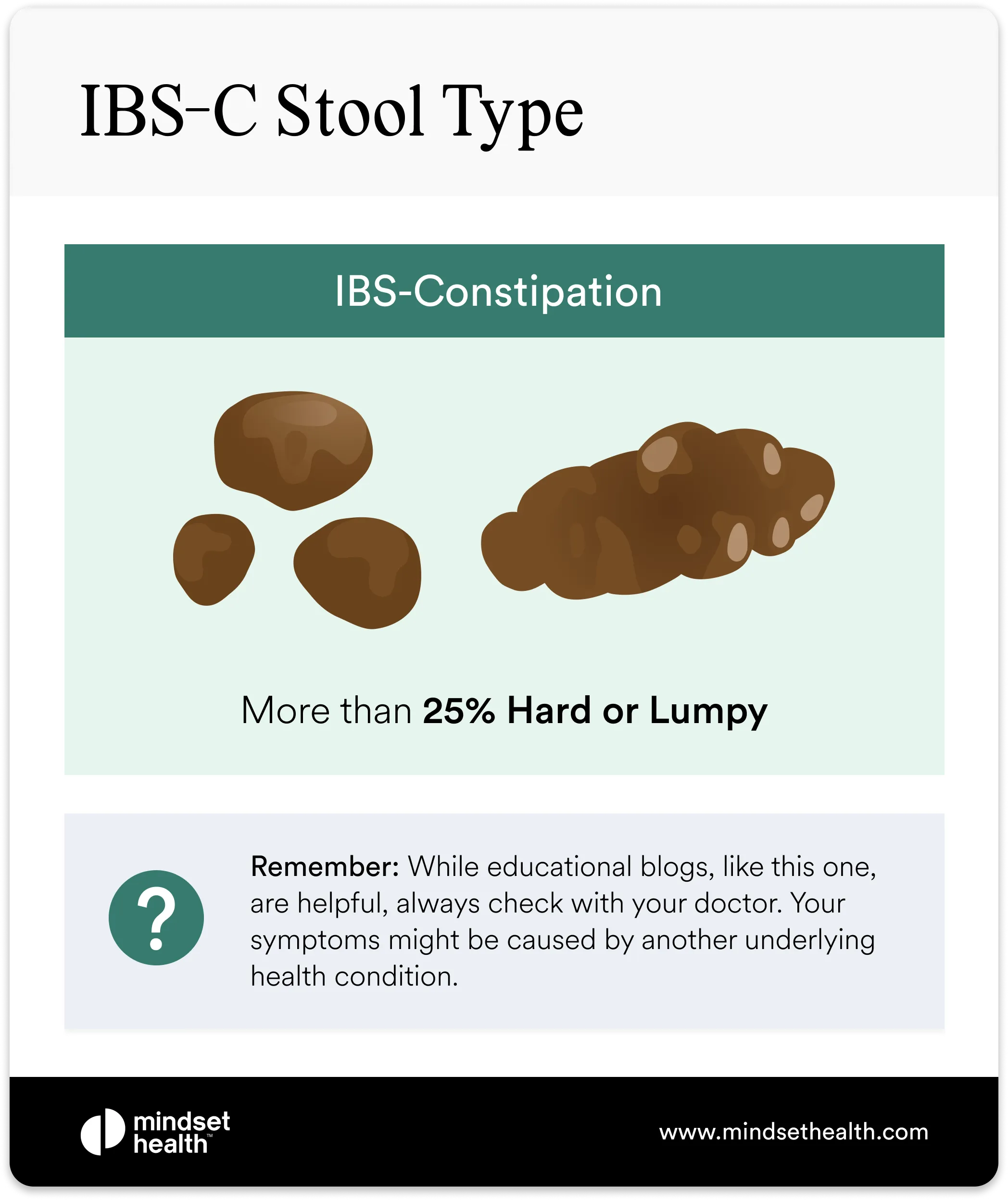 The ‘C’ in IBS-C stands for ‘constipation’. An IBS-C diagnosis requires at least 25% of your stools to be hard and lumpy, and fewer than 25% are loose in consistency.