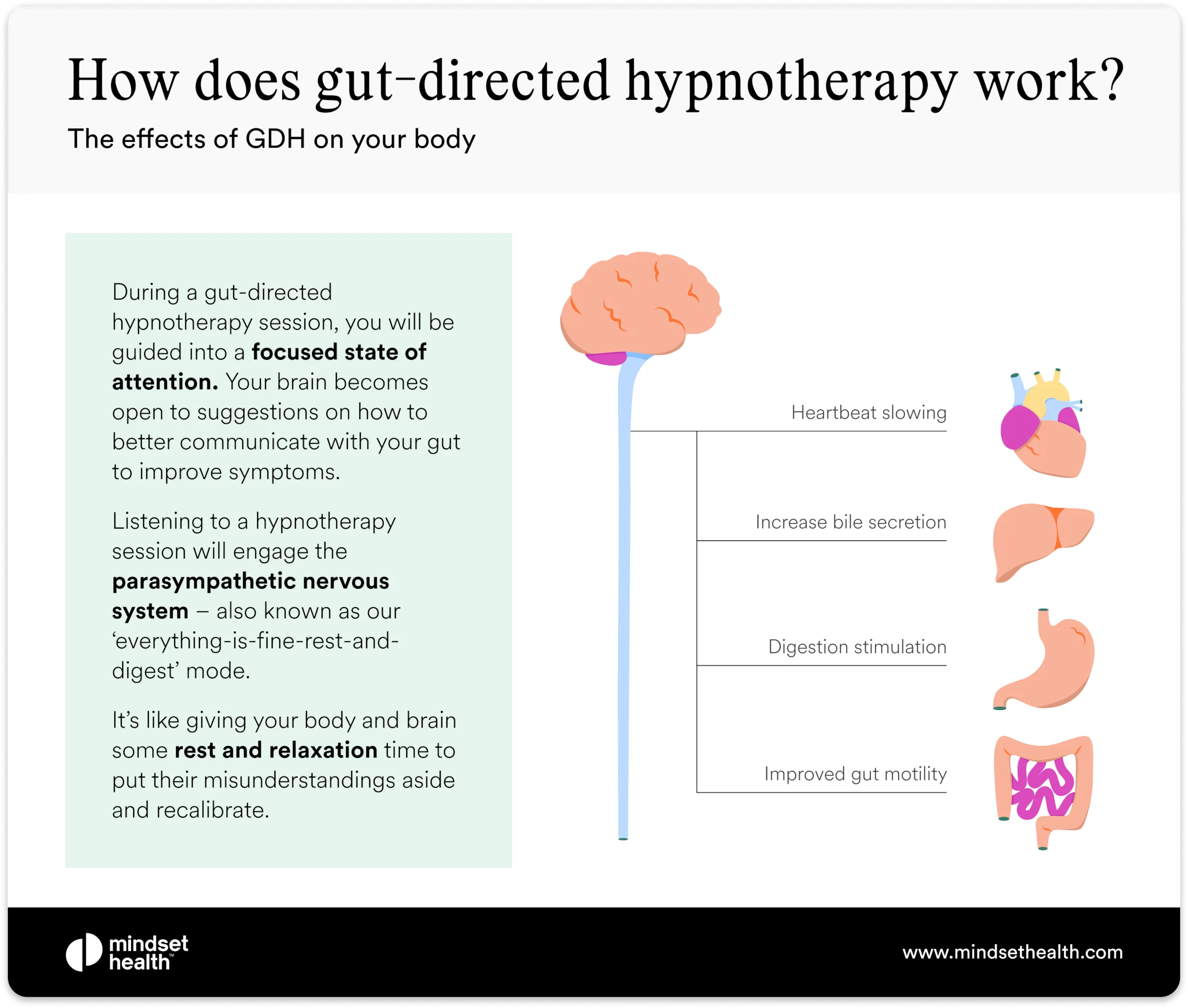 Since hypnotherapy is a relaxing exercise that stimulates your parasympathetic nervous system (responsible for rest and relaxation), it can effectively interrupt the cycle of stress-related IBS symptoms.
