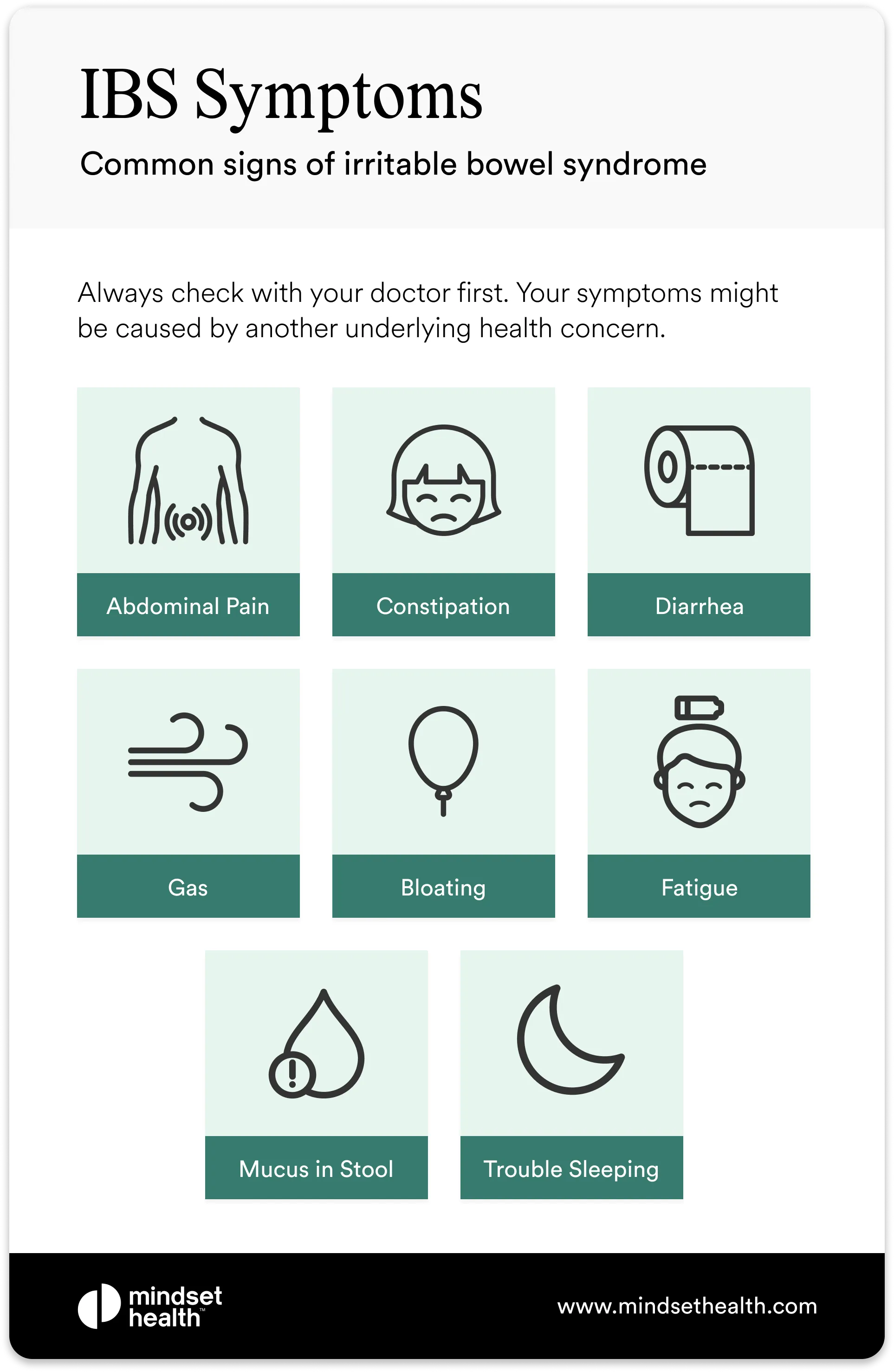 The most common symptoms of IBS are abdominal pain, constipation, and/or diarrhea. Other common IBS symptoms include gas and bloating, fatigue, mucus in stools, and trouble sleeping. IBS commonly occurs in people dealing with anxiety and depression. Fortunately, a range of evidence-based treatment options are available to manage IBS symptoms, including gut-directed hypnotherapy, the low FODMAP diet, and antidepressant medications.